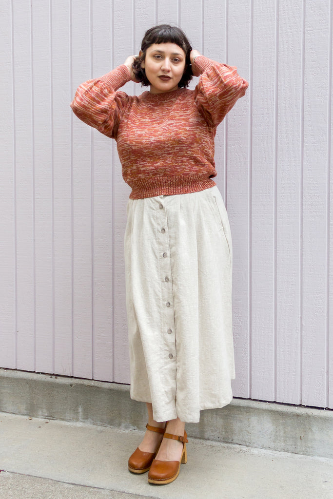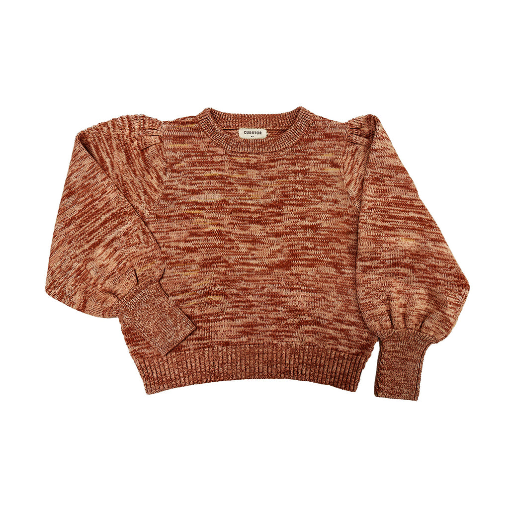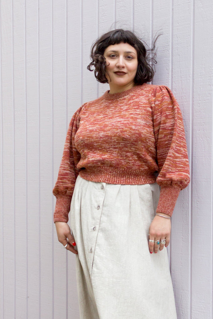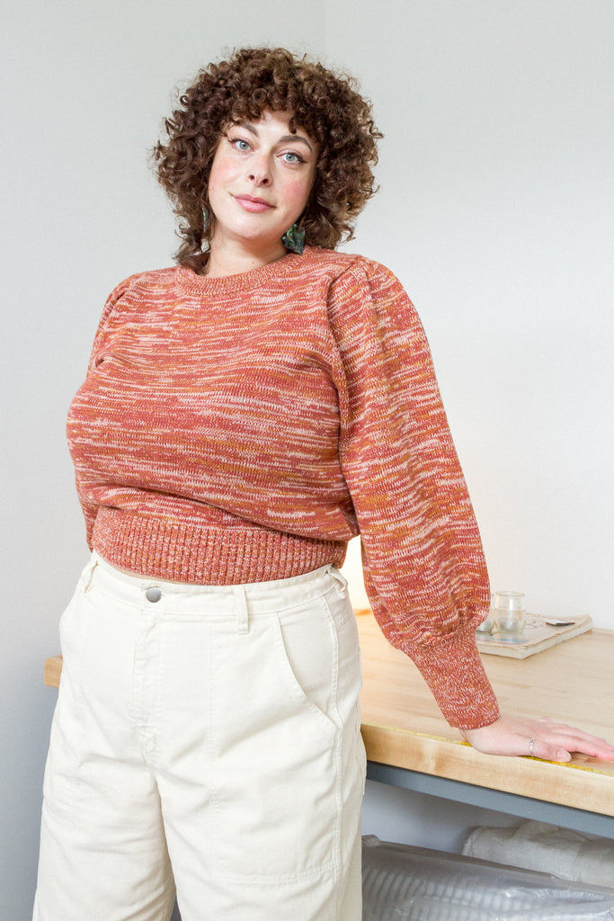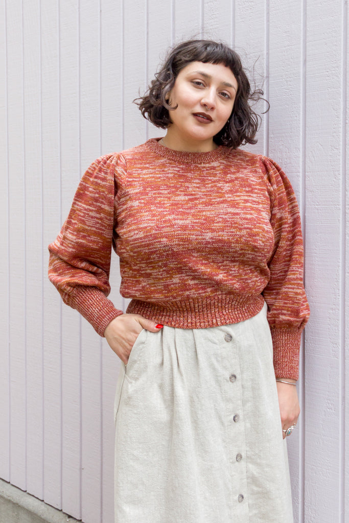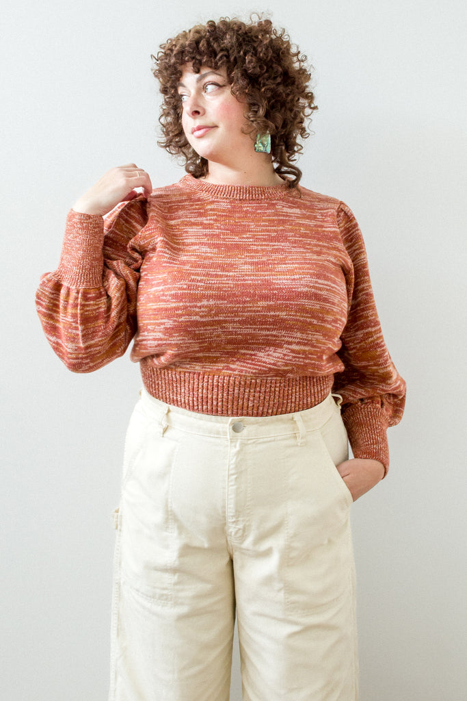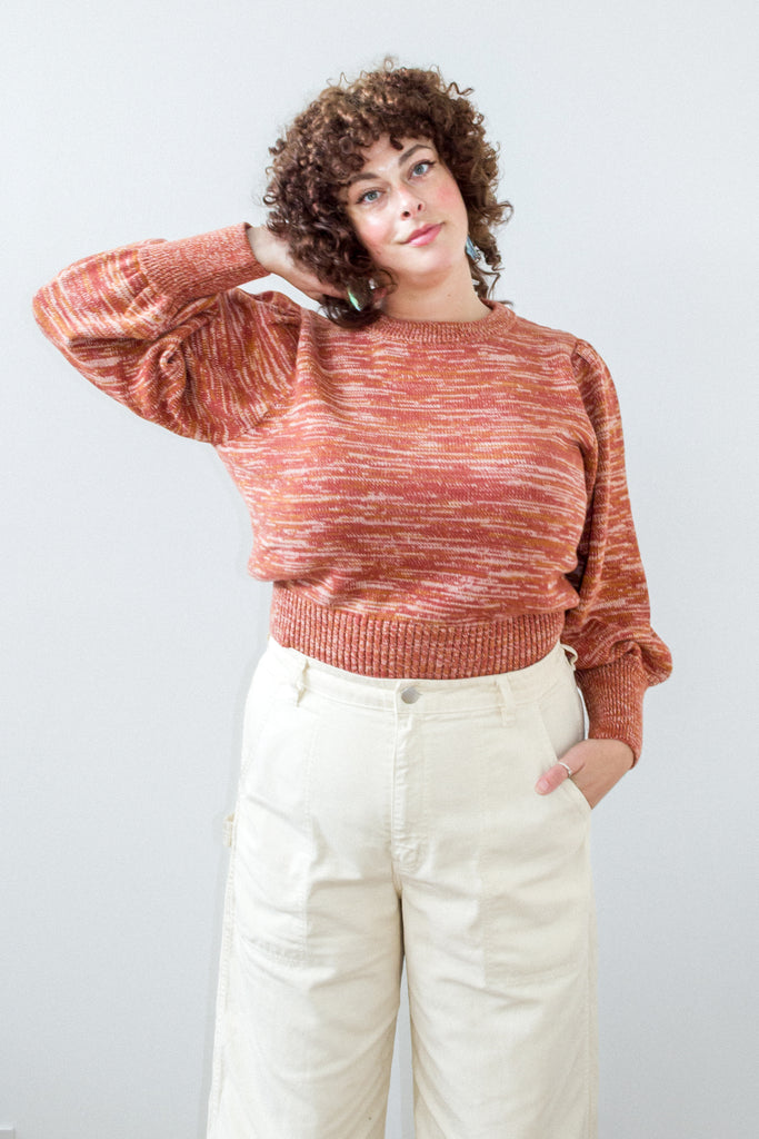 The Joni is a cozy crewneck sweater featuring pretty puffed bishop sleeves. Knit in a multi-color melange, it combines a classic body with sleeves that make a bold statement.